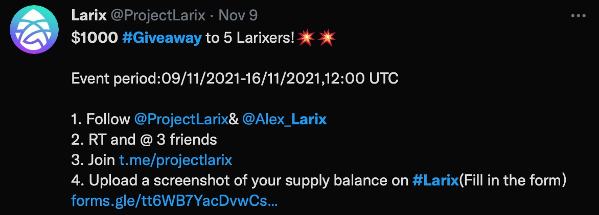On Nov 9th, Larix announced a $1000 giveaway to 5 Larixers.